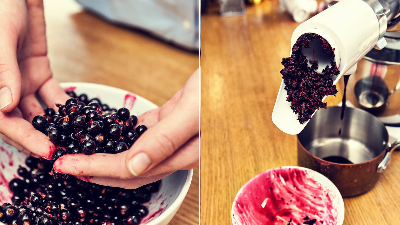 1. Třešně či višně vypeckujte, rybíz omyjte a odstopkujte. Pomocí lisu na ovoce ETA Gratus odšťavněte rybíz (za nízkých otáček, aby bylo výsledné šťávy co nejvíce). V malé misce promíchejte 2 lžíce cukru s pektinem.