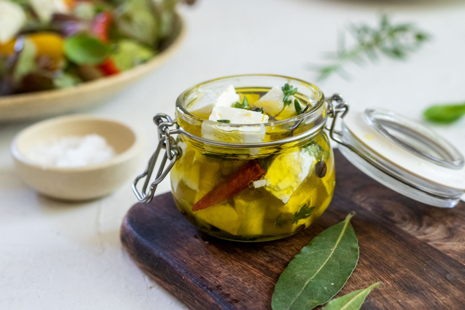 1. Sýr feta nakrájejte na menší kostky. Vkládejte do čisté sklenice, prokládejte bylinkami a kořením. Na 1 bloček sýra budou stačit 3 bobkové listy, 5 kuliček nového koření, 7 – 9 kuliček pepře, 1 – 2 stroužky česneku, 1 – 2 chilli papričky, pár snítek tymiánu a rozmarýnu. Zalijte olivovým olejem tak, aby byl sýr ponořený. Sklenici uzavřete a nechte přes noc odpočívat při pokojové teplotě. Poté uložte do lednice a nechte ideálně 2 dny odpočívat.