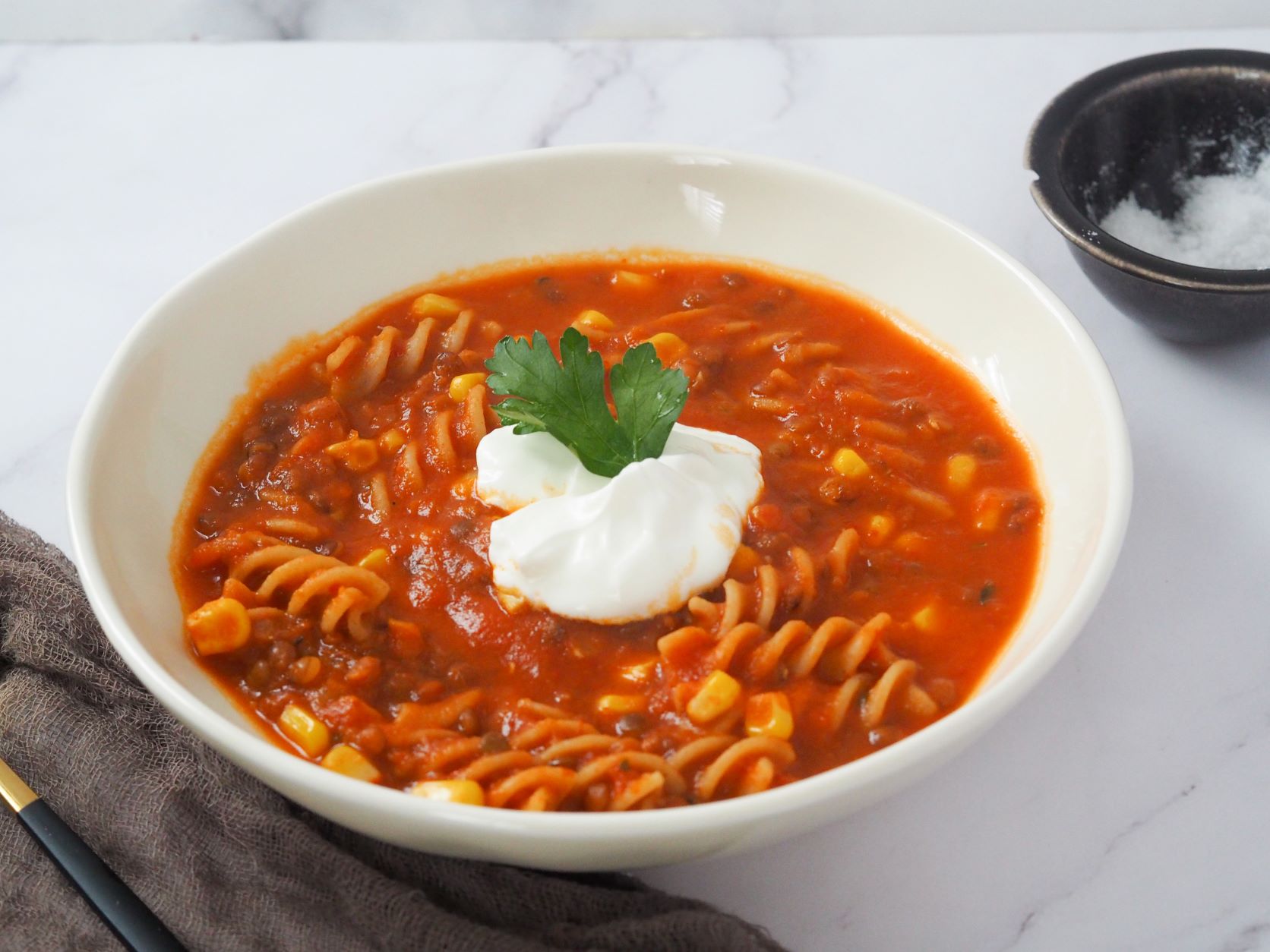 3. Rozmixovaná rajčata přelijte do hrnce. Vmíchejte čočku a těstoviny a vařte do změknutí.