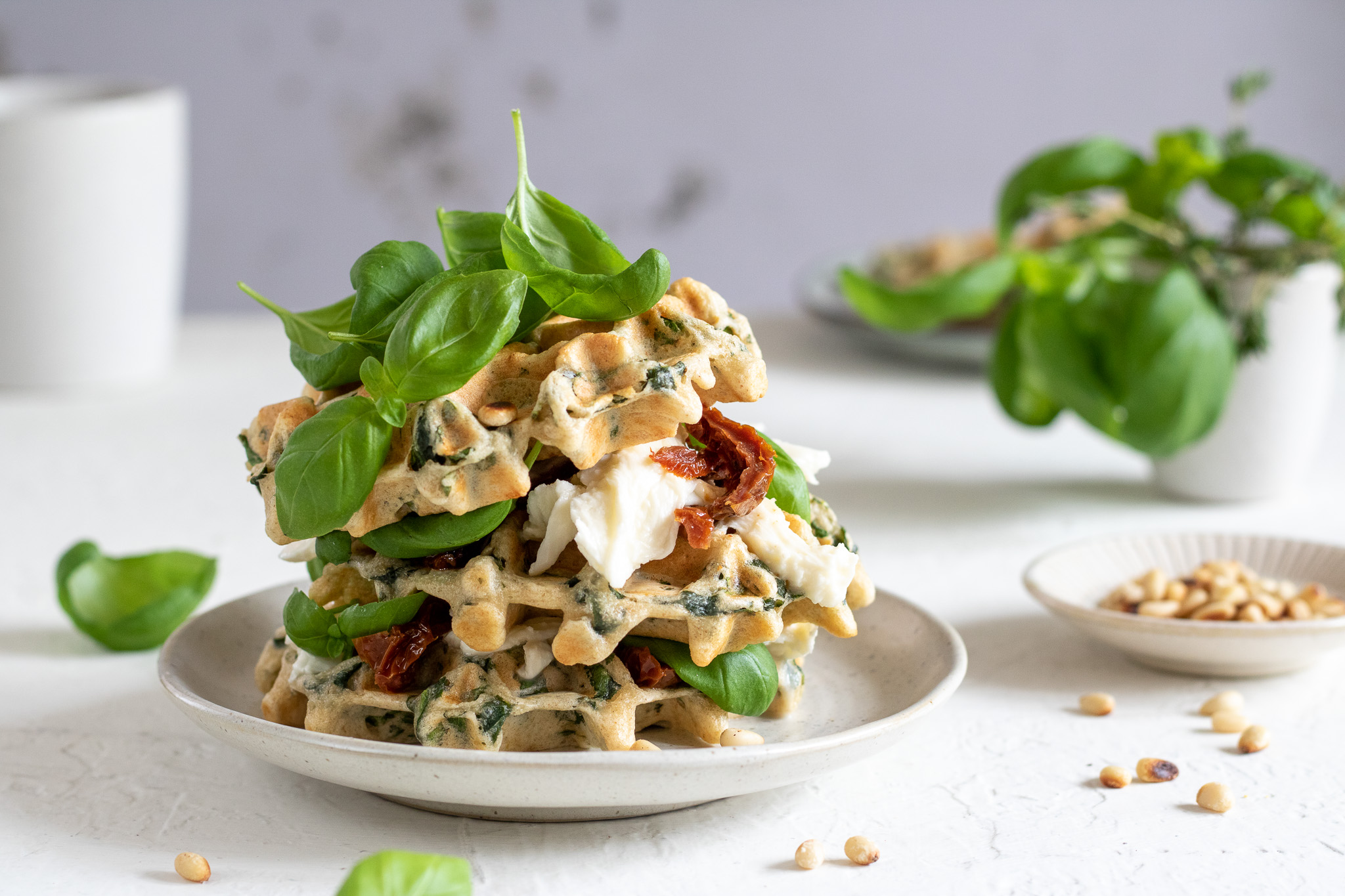 4. Vafle podávejte s natrhanou mozzarellou, sušenými rajčaty pokrájenými na proužky nebo najemno, nasucho opečenými piniovými semínky a čerstvou bazalkou.