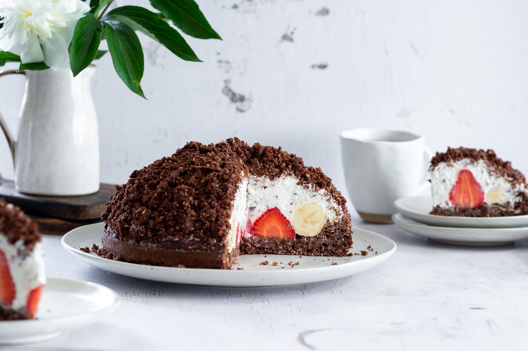 5. Z jahod odkrojte stopky. Řezem dolů je vyskládejte doprostřed korpusu. Kolem nic - po okrajích, vložte banán. Při jejich výběru hledejte ideálně ty, co jsou dobře zahnuté. Na vyložení po obvodu budete potřebovat 2/2,5 banánu.