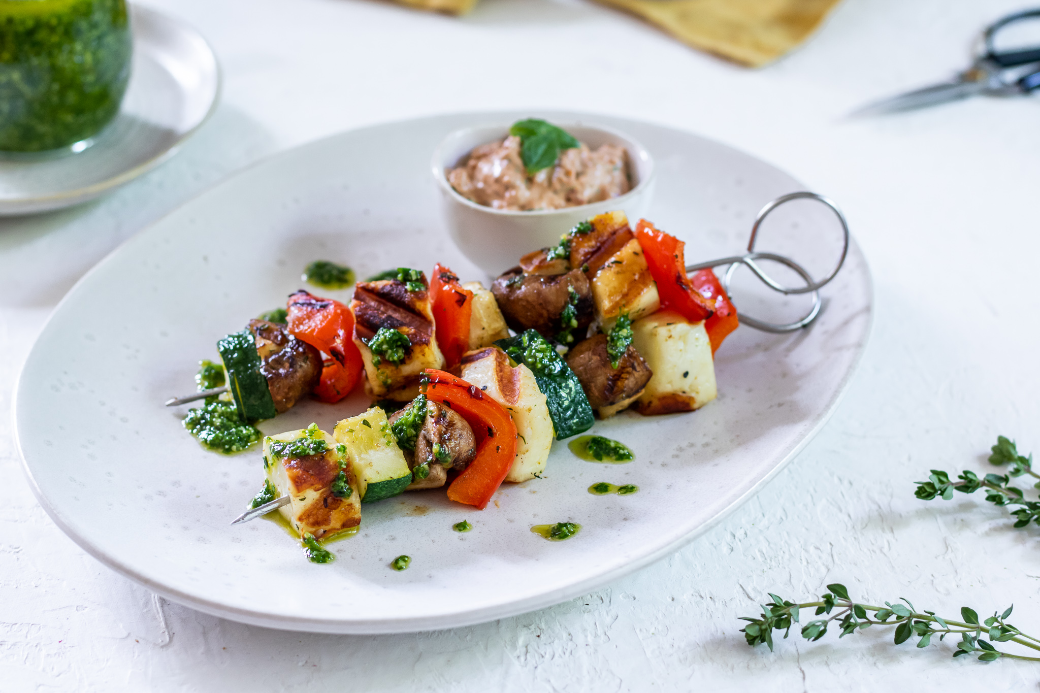 Zeleninové špízy s halloumi, špenátovým pestem a rajčatovým dipem