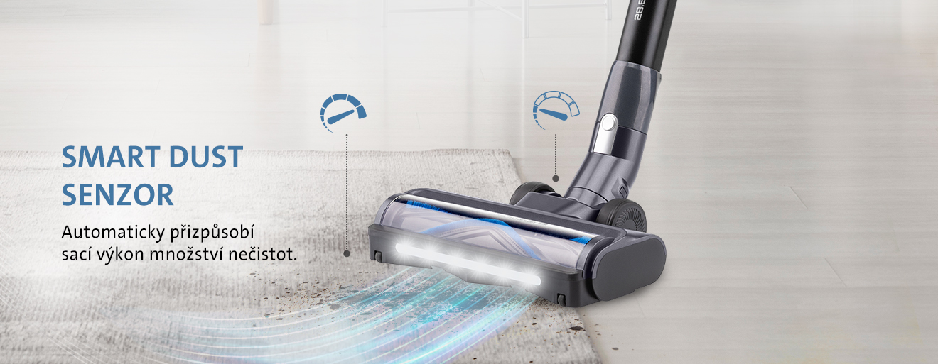 Inovativní SMART DUST SENZOR automaticky rozpozná množství nečistot a podle toho automaticky upraví sací výkon. Vysavač tak vždy pracuje efektivně – na hladkých podlahách úsporně, na kobercích s maximální silou. K tomu přispívá vysoká účinnost vysávání díky digitálnímu BLDC motoru a možnost nastavení 3 úrovní sacího výkonu.